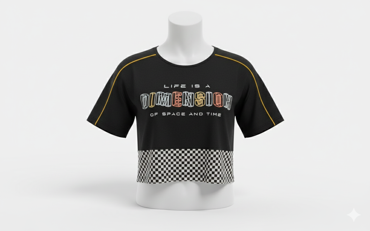 Graphic: The chest graphic reads “LIFE IS A DIMENSION OF SPACE AND TIME”. The word “DIMENSION” uses a 3D, outlined font in red, white, and yellow.