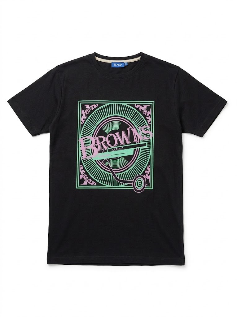 An eye-catching men’s short-sleeve crew neck t-shirt in solid black. The front features a large, vibrant graphic with a retro, neon-inspired aesthetic. The design is enclosed in a square frame and uses bright lime green and light purple/pink lines and text. The central text appears to read “BROWNS” with “CLASSIC” below it. This bold tee is perfect for casual, nightlife, or streetwear styles that embrace color and throwback graphics.