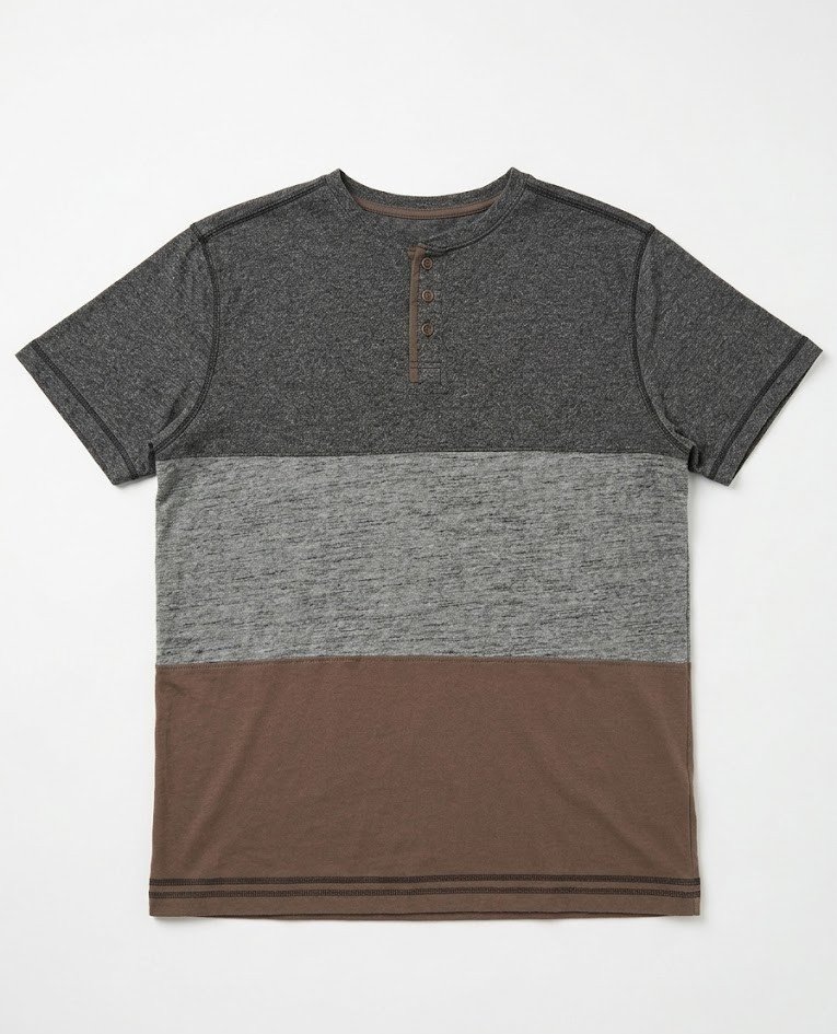 A casual and comfortable men’s short-sleeve shirt featuring a contemporary three-way color block design. The shirt transitions from a dark charcoal heather grey at the top (shoulders) to a lighter heather grey in the middle, and finishes with a solid brownish-taupe at the bottom. It features a four-button henley placket for a relaxed, versatile fit. Perfect for casual weekend wear.