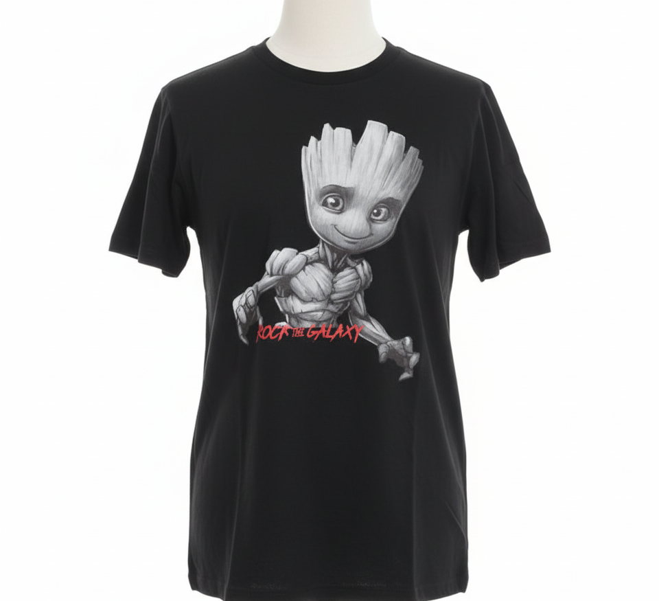 Show your love for the MCU with this officially licensed Marvel short-sleeve crew neck t-shirt. The classic black tee features a prominent, detailed graphic of Baby Groot (from Guardians of the Galaxy) in a dynamic pose. The graphic includes the phrase “ROCK THE GALAXY” in red text below the character. This comfortable, licensed apparel is a must-have for fans of Marvel and Groot!
