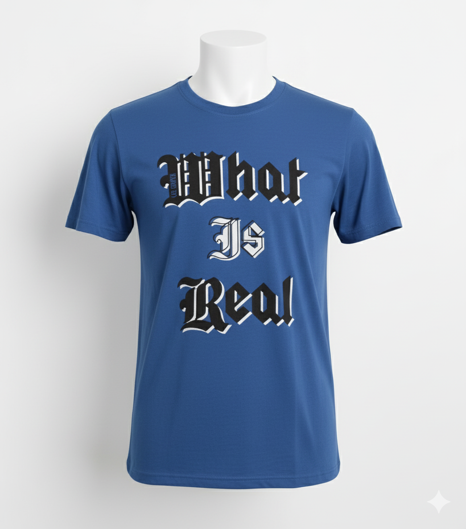 Make a philosophical and edgy statement with this men’s short-sleeve crew neck t-shirt in a vibrant royal blue color. The shirt features the phrase “What Is Real” printed boldly across the chest in a distinct black and white gothic or Old English style font. This tee is perfect for casual, alternative, or streetwear fashion.